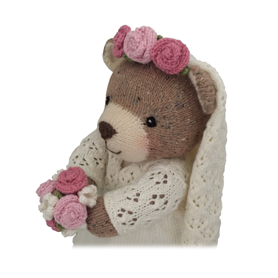 This 10 page pattern has clear row by row instructions and lots of photographs and video tutorials to help you along the way. The pattern includes the brides dress, veil, tiara, wedding shoes and bouquet.